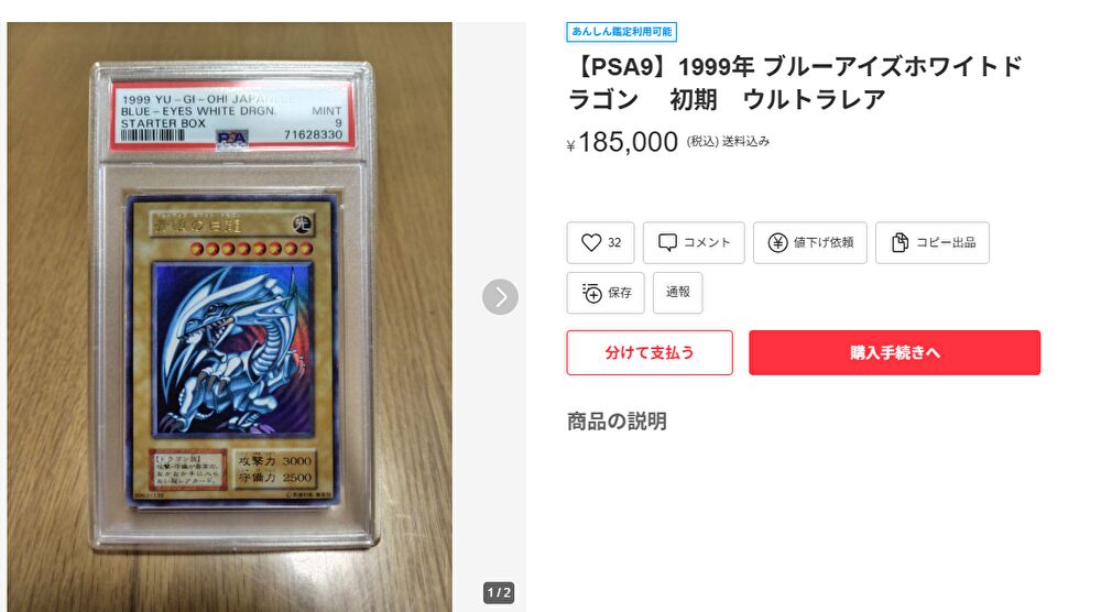 ブルーアイズ初期のPSA9はメルカリで18万5000円でした。