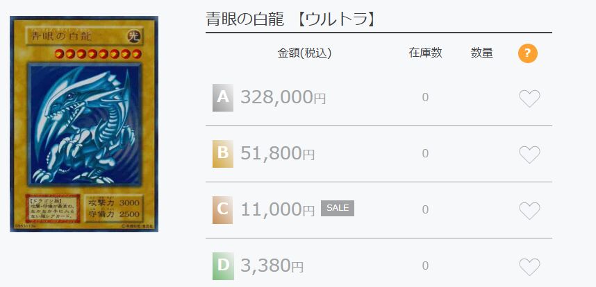 ブルーアイズの初期カードだと、一番安い状態Dで3,380円、一番高い状態Aだと、328,000円となっています。
